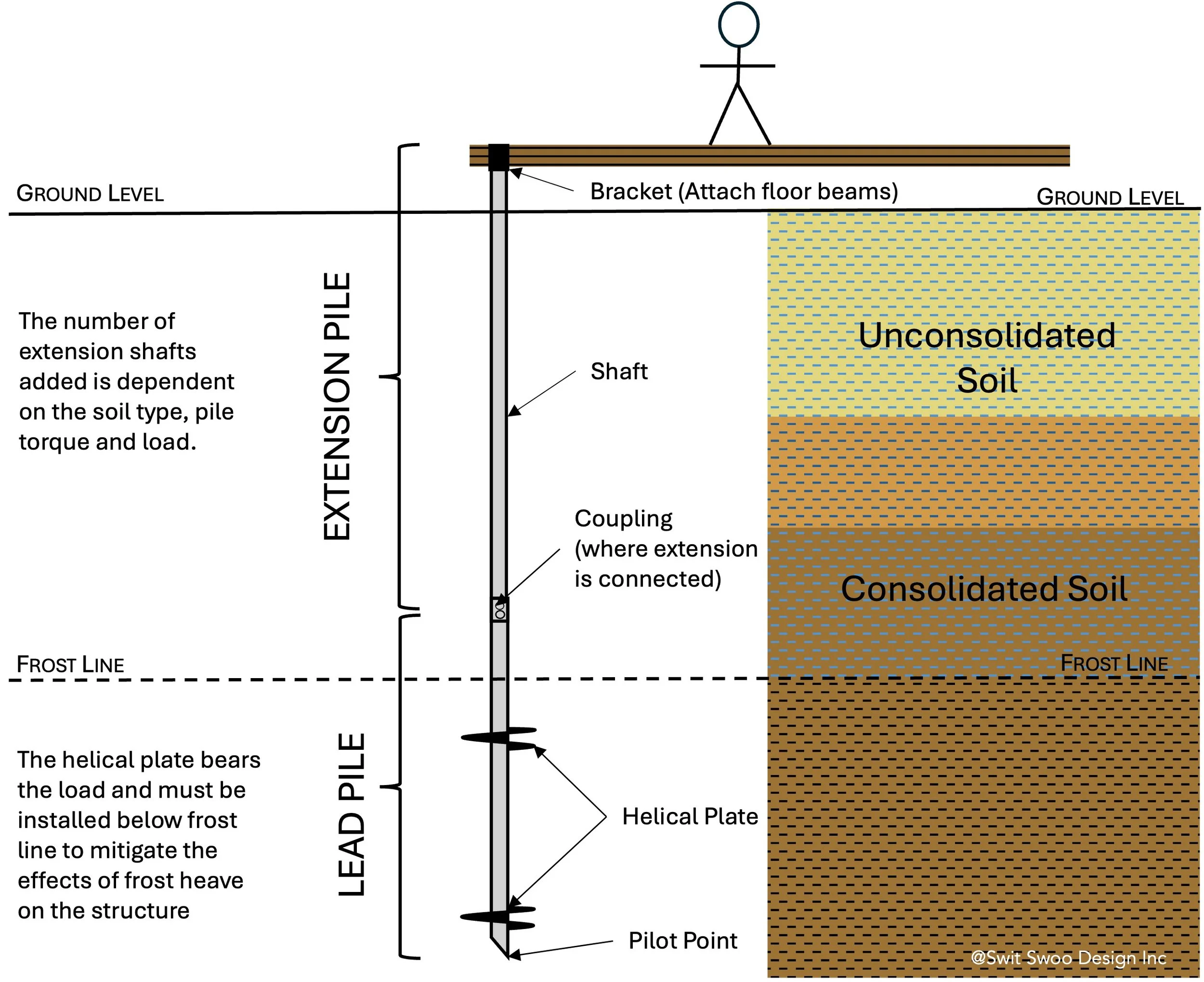 Screw pile foundations are also known as ‘helical pier foundations’ or ‘screw pier foundations’. They are what they sound like - giant screws or long galvanized steel shafts with helical plates. They are screwed into the ground to below frost line and provide structural stability and support. The helical plates provide the anchor in the ground below the frost line, thus mitigating the structure being subjected to frost heave.